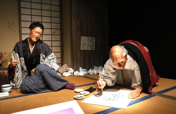 常設展示室では、30回も変えたといわれる雅号ごとに代表的な作品をエピソードなどを交えながら展示しています。さらに、門人が残した絵をもとに北斎84歳のころのアトリエの模型で忠実に再現しました。とくに人形の北斎がかすかに筆を動かすシーンには驚きます。