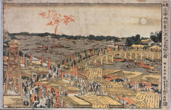 「新板浮絵両国橋夕涼花火見物之図」 大判錦絵 1781-89(天明年間)頃 「すみだ北斎美術館」