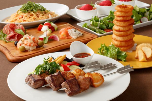 今年のお料理は、BBQのイメージを再現した牛・豚・鶏の3種類を一緒に堪能できるブロシェットをはじめ、ビールと抜群に相性の良いオニオンリングタワー、定番の枝豆やードブル、さらにはパスタやデザートを含む全7品のボリュームある内容です。