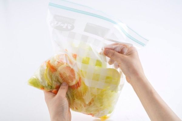 ② ジッパー付き保存バッグに材料をすべて入れて、口を閉じたら軽くモミ混ぜて10分置く。
