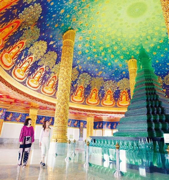 ツアーで最初に訪れるのはプラ・モンコン・テープムニーゆかりの寺院「ワット・パークナム」。最上階にはシンプルな白亜の外観の大仏塔からは想像もつかないようなカラフルなドーム型の天井仏画と、エメラルドに輝く仏塔が。バンコクでも随一の“インスタ映え”スポットは、最近SNSでも大人気。プラネタリウムのような異空間はぜひ押さえておきたい。