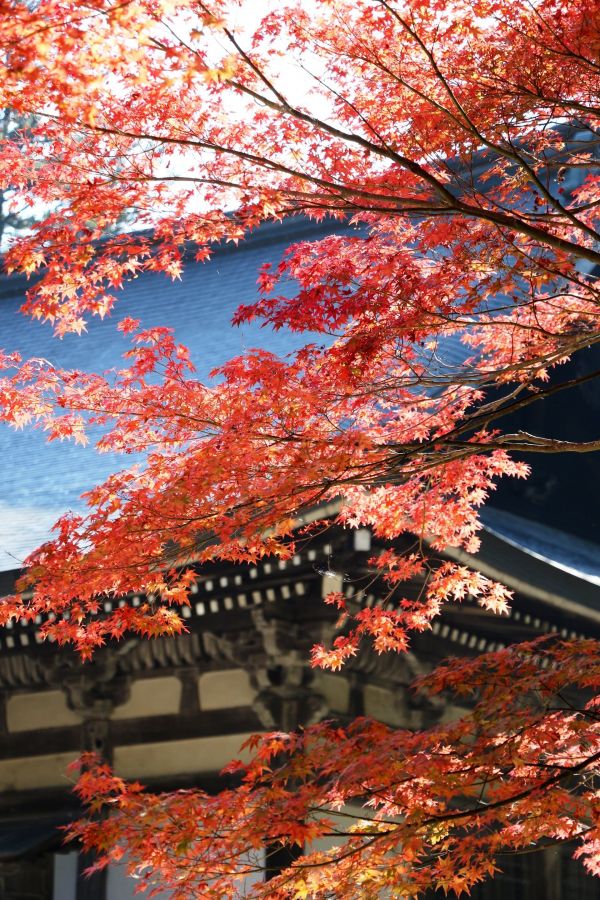 境内全体が赤い楓に包まれています。本殿や鐘楼の前の紅葉林がことのほか美しく、苔むした鐘楼が紅葉の色を引き立てているようにも思えます。金堂(本堂)の前には槇尾の名の元となった槙(まき)の大木が立っています。