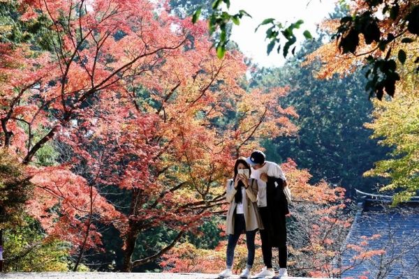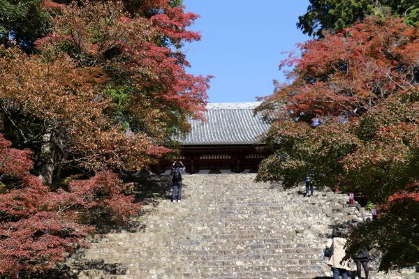 金堂へと続く古びた石段に赤や黄のカエデが覆いかぶさるように葉を落とし、色づいた葉の合間からお堂や塔が見え隠れする風景は情趣たっぷり。これぞ〝京都の紅葉〟といったところです。郊外デートにも最適かも。