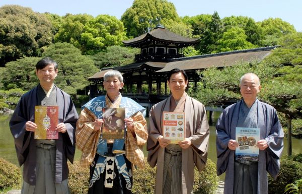 京都薪能のPRをする「京都能楽会」の井上裕久理事長(右から2人目)ら=京都市左京区の平安神宮