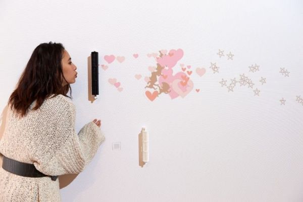 ≪風をかなでる≫では、エアコンの軽量・薄型に貢献した「ラインフローファン」のまっすぐに進む風を〝視覚化〟。「ラインフローファン」に息を吹きかけると、スクリーンにハートや花びらなどのアニメーションが登場します。
