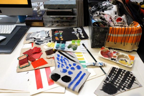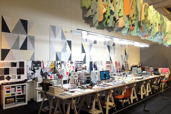 注目すべきは、ロンドン・コヴェントガーデンにあるオフィスを再現したコーナーです。机の上だけでなく椅子の上にも物が積み重なり座る隙間さえありません。片隅に置かれた開いたスーツケースの中には、鉄道模型が見えます。これは、日本での会議で重苦しい空気が漂ったときに突然広げ、会議を再び活性化するための小道具だそう。サプライズ好きでおちゃめなポールらしいエピソードですね。また、ハンガーに掛けられたスパゲティのプリントシャツは日本の食品サンプルを参考にして作ったものです。同じくコヴェントガーデンにあるデザインスタジオを再現したものも、ポールのデザインと服作りを理解する上で興味深い展示です。プリント柄の中でも最も人気のあるストライプ柄はすべてここで生み出されます。