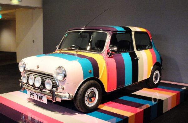 ファッションブランド「ポール・スミス」は、カメラ、オートバイ、自転車などさまざまなコラボレーションにチャレンジしてきましたが、初期の代表作がローバー社(2005年消滅、ミニはBMWが保有)のミニです。2015年秋冬コレクションで発表された「Pale Tone」と呼ばれる淡くて優しいストライプ柄を装飾した車の現物が展示されています。