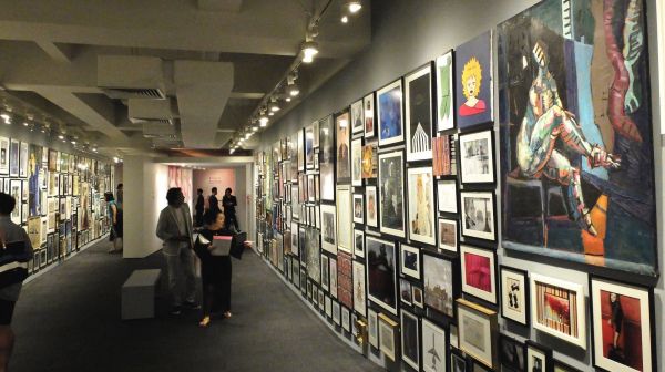 両側の壁面には写真や絵画などのアートコレクションがびっしりと張られています