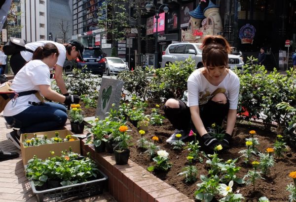 発表会終了後、高橋さんとボランティア20人は、渋谷公園通りの花壇の整備を実行。花壇のゴミ拾いや草むしりをして、新しい苗を植えました。苗は、福島県立相馬南高校の生徒たちが育てたマリーゴールド、ガーデンダリア、ガザニアの180株。晴天で気温も上昇する中、土に向かって作業する参加者は暑さをものともせず、とてもさわやかで楽しそうでした。