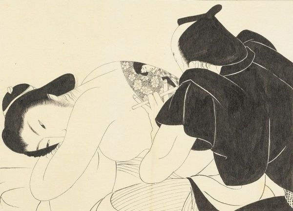 魅力は余白を生かした画面構成と簡潔な線による無駄のない描写だ。「春告鳥」。シンプルな柄の着物姿で屈む若い女性。振り返る視線の先には、1羽のウグイスが飛ぶ。驚くでもなく優しい表情で見つめる。画面の上から芽吹き始めた柳の枝が垂れ、春の到来を告げる。柳の幹を描かないことで、空間が広がり余韻を残す。爽やかで繊細な詩情があふれる。