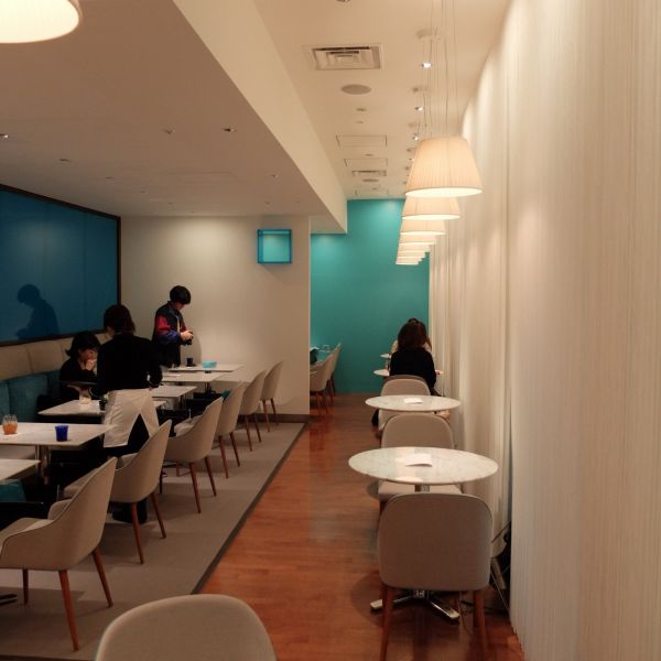 店内は、白を基調にしつつ、東京カンパネラのトレードマークであるブルーをクッションや壁などに取り入れた、おしゃれな雰囲気です。大丸は、場所がら比較的年齢の高いお客様が多いとのことですが、4階にあるこのカフェは20~30代の女性が利用しやすいようにアレンジしたそうです。