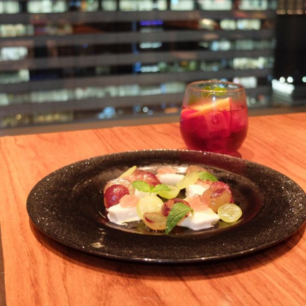 前菜は、国産の原料で手作りしたモッツアレラチーズと2種類のブドウ、フランボワーズのジュレを組み合わせたもの。ぶどうの甘酸っぱさとモッツアレラチーズの相性が絶妙です。