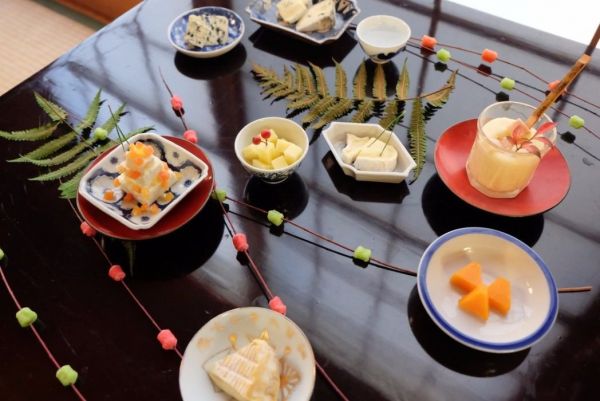 チーズにも遊び心をプラス。オレンジ色のチーズは富士山型にカットし、ドライフルーツをまぶしたフレッシュチーズは、三重塔に。とろりとしたウォッシュチーズは、ガラスの器に入れて茶菓子風に仕上げました。