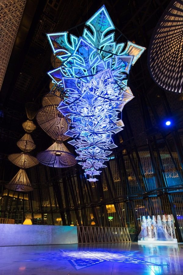 地下2階のエントランスにあるのは、エルサの魔法で生まれた氷や雪の結晶が散りばめられた“Ice Tree”。雪だるまのオラフが楽しげに駆け回っています。