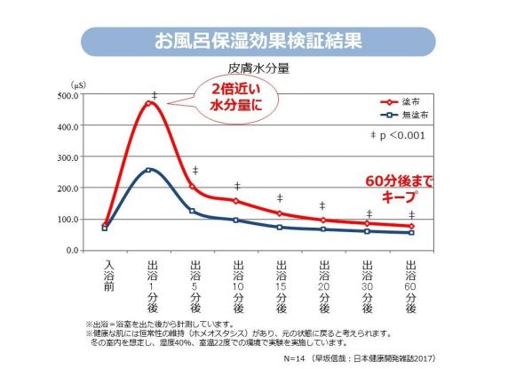 次に、入浴中の保湿による、出浴後の肌乾燥予防効果を検証するために、入浴中に保湿化粧品(泡状パック製品)を肌に塗布した場合としない場合で肌水分量を比較。すると、保湿化粧品を塗布したグループは、無塗布のグループより出浴後の肌水分量が高い結果に。特に出浴1分後から約2倍近い水分量を保ち、出浴60分後まで入浴前の肌水分量をキープしていました。