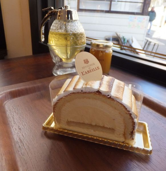 スタンダードなアカシアの風味では満足しない、ハチミツ好きにぜひオススメしたいのが、ムースオミエル(648円)。ラベイユ本店で販売され、大人気だった「荻窪ロール」(2017年11月末販売終了)の〝進化〟版で、ハンガリー産アカシアのクリームの周りに、フランス産プロヴァンスを使ったムース、アカシアを使ったイタリアンメレンゲを重ねたハチミツ尽くしのロールケーキです。食べたとたん、花園のようなハーブ感が特徴のプロヴァンスの香りと甘味が口いっぱいに広がり、アカシアのしっとりとした味わいが優しく包んでくれます。ハチミツの魅力がいっぱい詰まったケーキです。