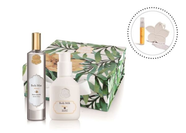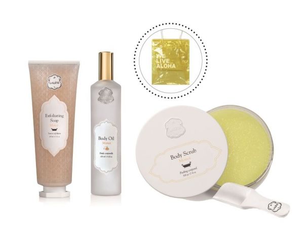 ハワイ限定ボックスにボディミスト、ボディミルク、ハワイ限定のフレグランスセラミックが入った「Monoi プルメリアセット」