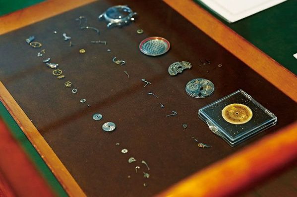 1つの時計を分解すると、細かな部品がいくつも複雑に組み合わさっているのがわかる。普段なかなか目にすることのないこれらの部品は、店頭受付に展示されている