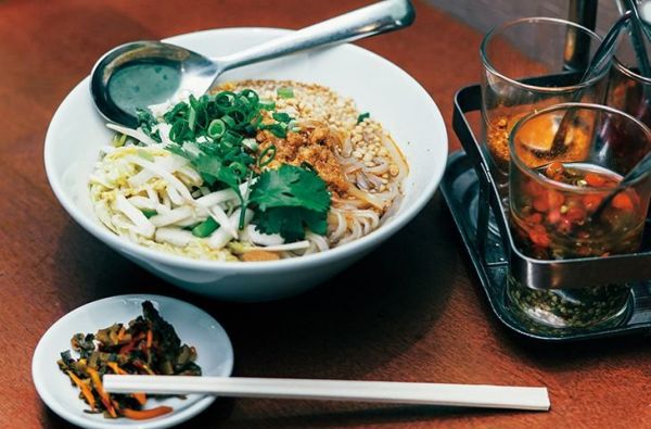 ミャンマー国内でもブームが巻き起こりつつある“シャン民族”の家庭料理「シャンカウスェ(シャンヌードル)」は、鶏ガラ出汁のスープに米麺を使用した、まろやかな味わいのヘルシーなヌードル。ナッツやひき肉、もやしに白菜などたくさんの具がトッピングされ、アクセントのパクチーがうれしい。お好みでナンプラーや唐辛子を合わせてどうぞ。
