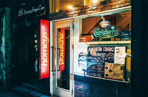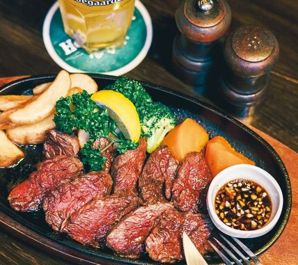 36年営業するバー&ダイナーでは、終電を過ぎた夜中までステーキが味わえる。選べるソースの中でも、国産のにんにくのみを使用した「にんにく醤油」はいち押し。ハラミの肉質はやわらかく、重たくないので、ぱくぱく食べ進められる。フレッシュカクテルや5種の生ビールなど、ドリンクの種類も豊富なので、好きなお酒を合わせて味わおう。