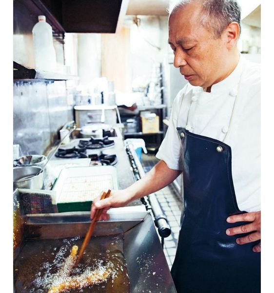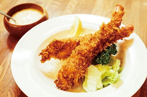 上野で70年にわたって地元の人々に愛されている、街の洋食屋さん「宝亭」。かつて、給料日には、近隣のサラリーマンたちがこぞって駆けつけたという。人気の日替わりのランチとともに、おすすめは“特大”のエビフライ。新鮮な天然のエビを丁寧に下処理して、衣をつけ、カラッと揚げる。小皿に盛った自家製のタルタルソースをたっぷりのせて、頭の部分からぱくり。レモンを利かせたソースの香りが鼻に抜けつつ、口の中がプリップリのエビで満たされる、口福な一口。