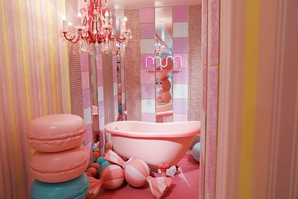 この店の装飾は、スイーツアーティストのKUNIKA(クニカ)さんがプロデュース。メインオブジェの巨大ケーキや、ソファーや天蓋がかわいらしいスイートバスルーム、大きな万華鏡に入り込んだような感覚を味わえる不思議なスイーツフォトスタジオなど、KUNIKAさん独特の世界観で〝お菓子の国〟が表現されています。