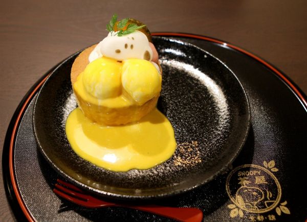 38席ある2階のカフェのコンセプトは「はんなり」。京都弁で「明るく華やかなさま」という意味です。西陣織のパネルや京唐紙などにスヌーピーがモチーフとしてあしらわれ、なんと欄間(らんま)にもスヌーピーが彫られています。カフェメニューも充実しています。京野菜などを使った「スヌーピー彩り京都御膳 天ぷら付き」という名の松花堂弁当(1980円)は、京茄子をくり抜いて仕立てた器に京野菜を入れたり、生湯葉をあしらったりと季節のいろどりも華やかな日本料理と、スヌーピーがコラボした一品です。「白味噌クリームのハンバーグオムライス」(1480円)や、「京みぶ菜と鮭のぶぶ漬パスタ」(950円)などのお食事もあります。さらに、デザート類もバラエティーに富んでいます。「京の野菜いろどりパフェ」(1050円)、「きな粉と黒蜜の厚焼きパンケーキ」(1180円)、「かぼちゃソースの厚焼きパンケーキ」(1180円)など、目移りしそうです。