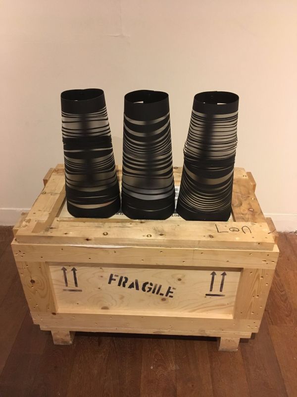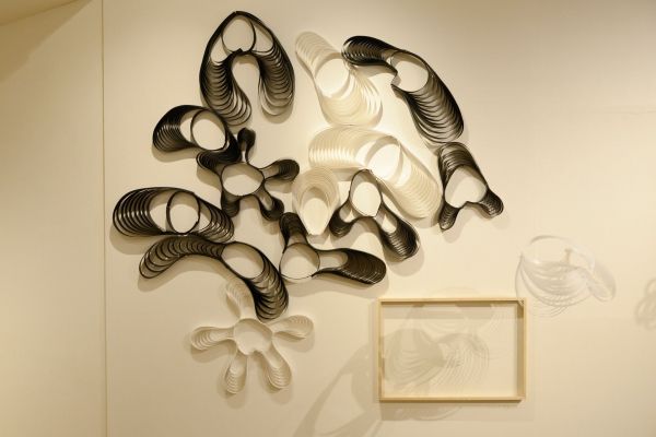 河野氏によると、当初は、羽毛や釘、レースやレザー、クリスタルなど頭に合いそうな素材からインスピレーションを受けてヘッドプロップを制作。しかし、「これではどこかで見たことのあるものしか生まれない」と、それまでの素材ありきの手法を捨て、まずは新しい形そのものを探る手法に変えることで自身のスタイルを一新しようと試みました。そうすることで、頭の形にとらわれない斬新な形のデザインを作ることが可能になりました。 会場では、主にファッションショーのランウェイというステージに現れた実物のヘッドプロップをインスタレーションとして展示。ビニールやスポンジなど、さまざまな素材で作られたヘッドプロップは、一見 頭の装着物に見えないものもあり、見るものに新しいデザインとは何かを問いかけているようです。
